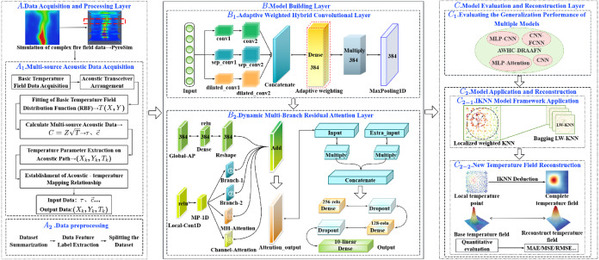 在建筑火灾领域,实现对三维温度场的全局、实时、精准感知,对于提升火灾救援效率、保障消防人员安全具有重要的现实意义。然而,传统传感器检测空间覆盖有限,而数值模拟方法对初始条件依赖性强,难以满足复杂动态火灾环境下的实时监测需求。针对此问题,秦恒洁老师课题组首次将声学CT测温技术应用于建筑火灾场景,创新性地提出了一种由多源声波数据驱动的温度场重构新框架。该框架融合了自适应加权混合卷积-动态残差注意力感知融合网络(AWHC-DRAAFN)与集成K近邻(IKNN)模型,通过深度学习高效提取并融合声波传播与温度分布之间的复杂非线性关系,最终将离散的温度数据转化为连续的温度场。