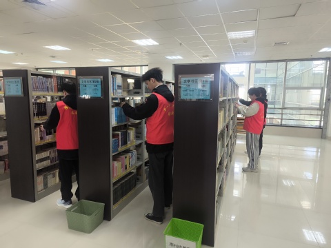 志愿者们身着统一服装走进逸夫图书馆,向图书馆管理员认真学习了图书分类标准、整理方法及操作规范,在明确工作要求后,迅速分组到位,进入工作状态。活动现场,志愿者们干劲十足、分工明确,配合默契。有的弯腰捡拾散落的书籍,细心将其按类别、序号准确归位;有的逐排核对图书信息,耐心纠正错位、放反的书籍,让每一本“迷路”的图书重新“归队”;有的轻轻擦拭书架浮尘,细致清理阅览区杂物,用双手为师生营造整洁有序的阅读环境。整个服务过程中,志愿者们始终保持轻手轻脚、轻拿轻放,时刻注意不影响馆内阅读学习的师生,全力维护图书馆安静、温馨的阅览氛围。经过志愿者们的辛勤努力,逸夫图书馆的阅览区、书架区焕然一新,书籍摆放整齐规范,环境更加干净整洁。